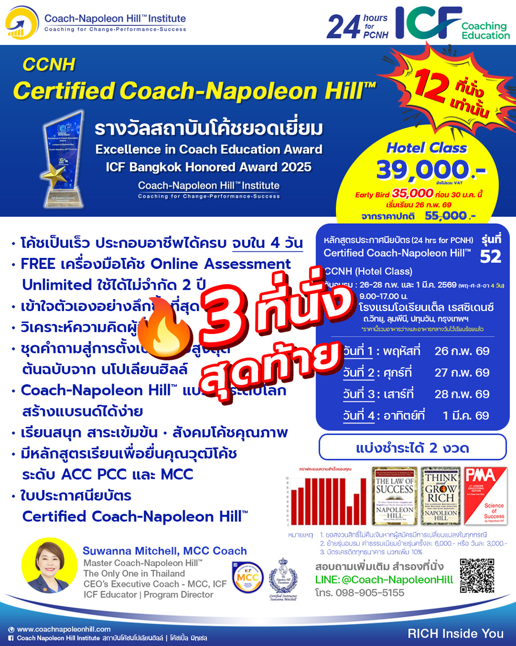 รีบแอดไลน์ @Coach-NapoleonHill แล้วแจ้งทีมงานได้เลยว่า “สมัครเรียนโค้ชนโปเลียนฮิลล์ ราคา Early Bird” สำรองที่นั่งเพียง 10,000 บาทครับ