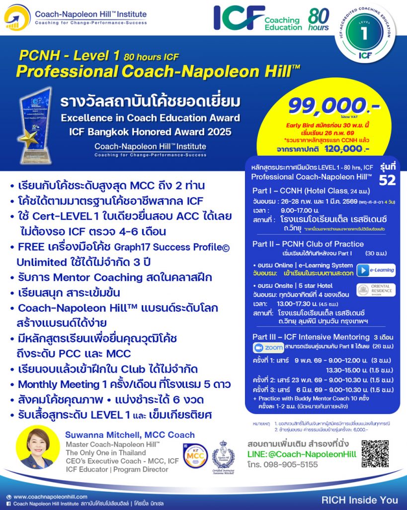 หลักสูตร Professional Coach-Napoleon Hill™ (80 hrs LEVEL 1, ICF) รุ่นที่ 52